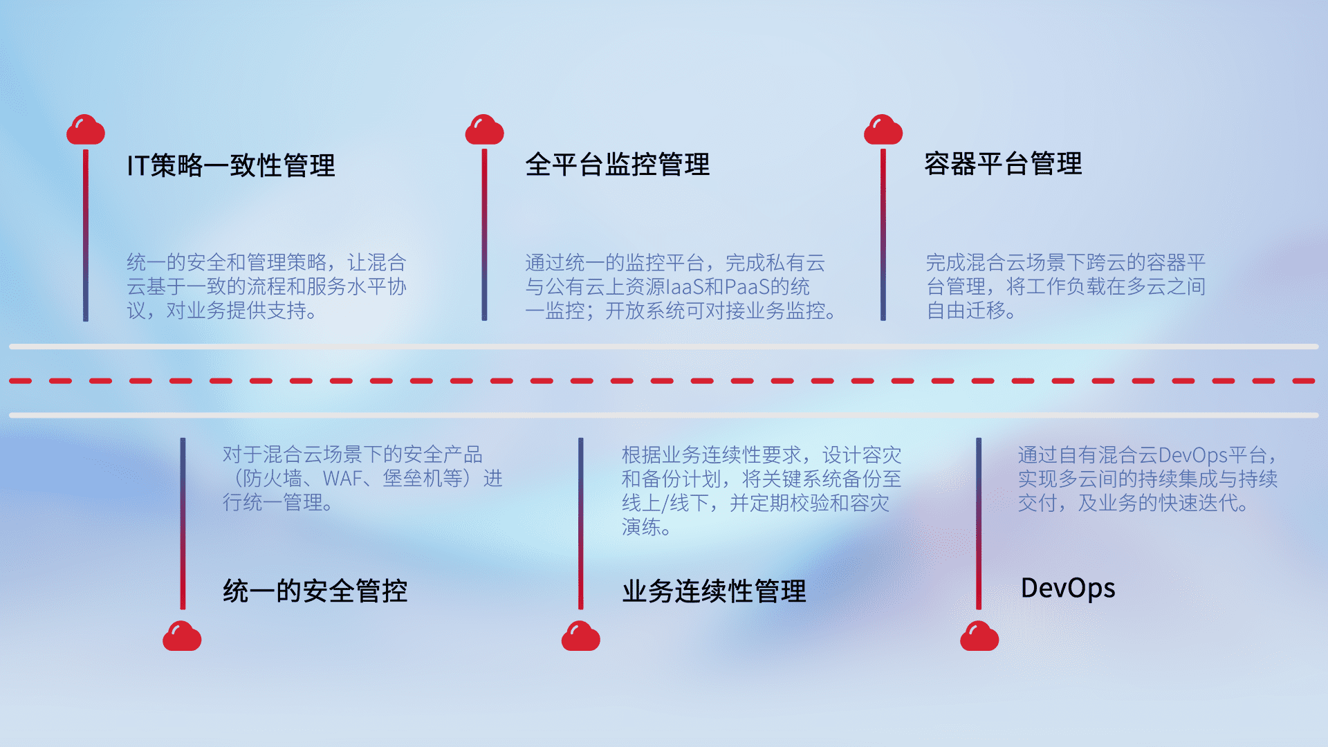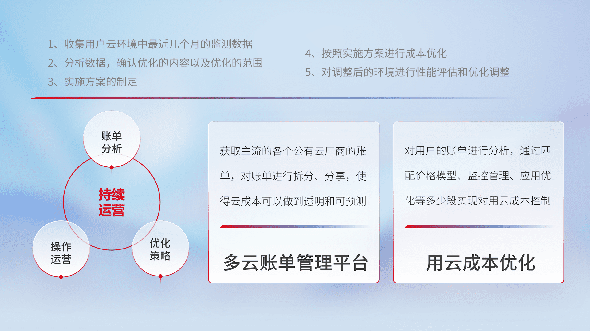 通过多云纳管,,,以统一的资源数据模型把客户的云资源进行抽象和封装,,进而实现对多云资源的统一操作,,,保障云资源管理的可靠性、、稳定性与可用性。。量身定制化运维内容,,配置、、、、开发运维、、补丁管理、、、备份、、监控、、、、认证和访问管理、、、审计和日常巡检等,,保障在用云过程中的可靠度,,,稳定度以及高可用率。。。。